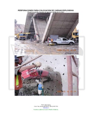 PERFORACIONES PARA COLOCACION DE CARGAS EXPLOSIVAS (Puente Loncomilla, Comando de Ingenieros del Ejercito de Chile) Til Til 1980, Ñuñoa Fono / fax: (56 2) 2205 4818 / (56 9) 519 7116 www.yts.cl Nosotros cuidamos nuestro Medio Ambiente.