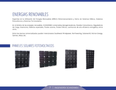 En el ámbito de las energías renovables, SCANDIMEX comercializa Aerogeneradores, Paneles Fotovoltaicos, Reguladores