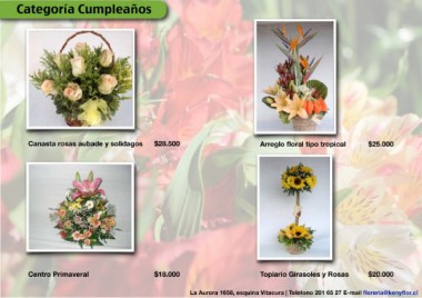 Categoría Cumpleaños Canasta rosas aubade y solidagos $28.500 Arreglo floral tipo tropical $25.000 Centro Primaveral $18.000 Topiario Girasoles y Rosas $20.000 La Aurora 1656, esquina Vitacura | Teléfono 201 65 27 E-mail floreria@kenyflor.cl