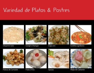 Variedad de Platos & Postres Chaumin Solo Congrio Shangai Copa oro Costillas agridulce Fideos de CamarĂ³n Fruta China Gyosas Hojas de CamarĂ³n