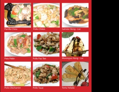 Parrilla China Pollo Chiten Salmón Hong - Loc Pato Pekin Pollo Pao Ten Merengue Hong - Loc Pollo Chicharrón Pollo Tausi Torta Helada